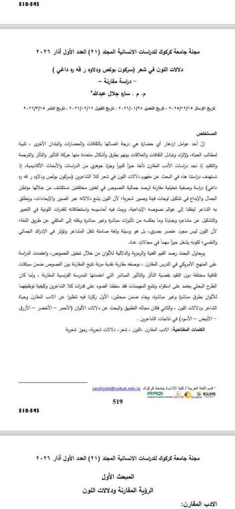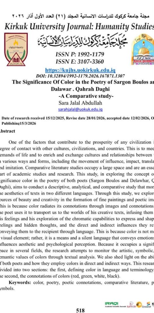 توێژینەوەیەکی مامۆستا “سارا جەلال عەبدوڵڵا“؛ لە گۆڤاری زانکۆی کەرکووک بۆ توێژینەوەی